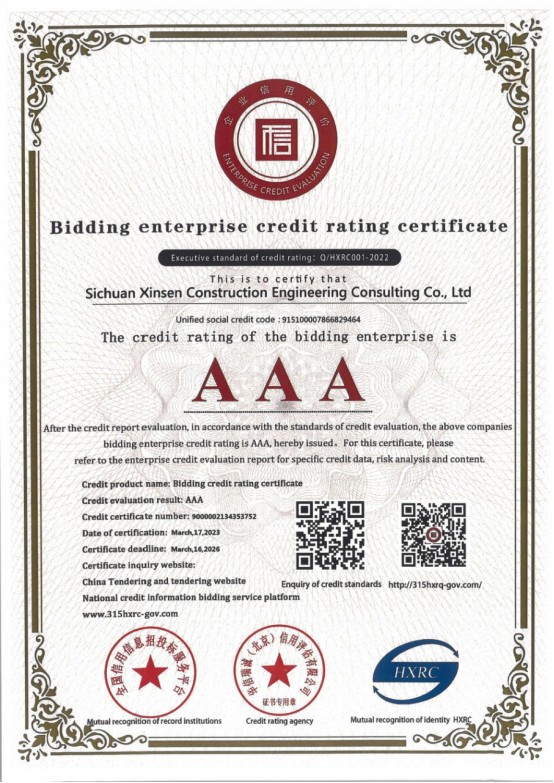 喜报-四川鑫森取得招投标企业信用等级证书AAA